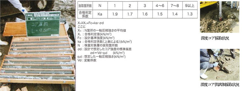 本コラム又は採取用コラムより、100本毎に1箇所、1箇所あたり3個の供試体を採取します。材令28日における一軸圧縮強度試験の結果が下記の式をクリアしなければならず、合否の判定は。N箇所(抜取個数)の一軸圧縮強さの平均値×Nと合格判定値×Lの大小関係を比較することで行います。